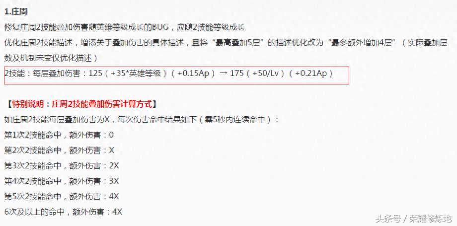 在今天下午的游戏更新中,这一bug已经得到修复并且给出了庄周2技能的伤害计算方式,同时对2技能进行了增强:每层叠加伤害:125(+35*英雄等级)(+0.15Ap) → 175(+50/Lv)(+0.21Ap)