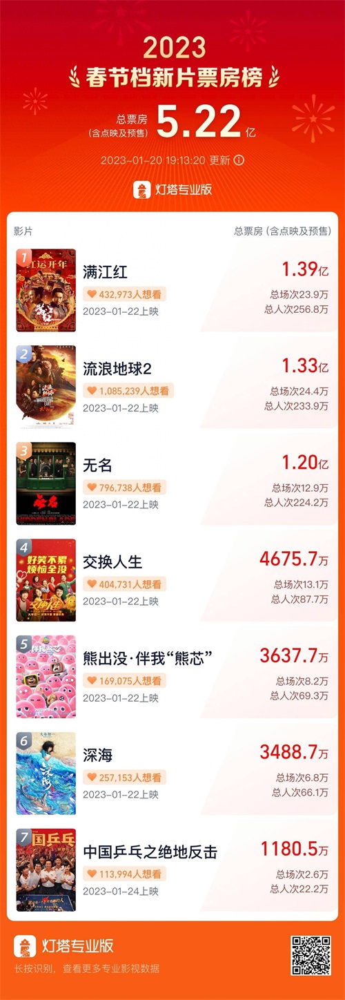 据灯塔专业版数据,截至1月20日18时35分,2023春节档(1月21日-1月27日)预售总票房突破5亿。