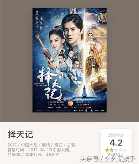 鹿晗和古力娜扎主演的《择天记》豆瓣评分4.2,鹿晗被批缺少男性的阳刚,与古力娜扎不配。
