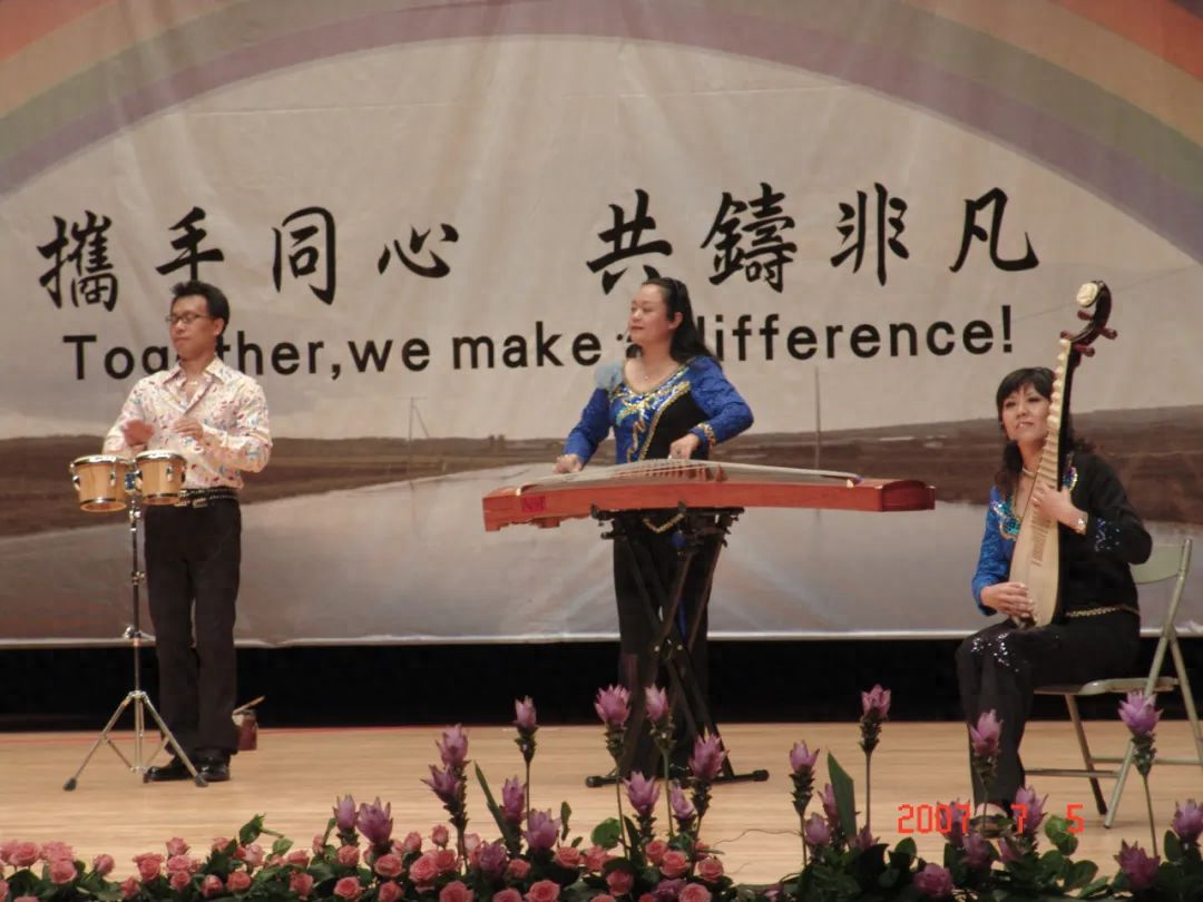 马海燕(中)在台中县总工会六十周年庆祝大会上演奏、演唱《台湾校园歌曲联奏》