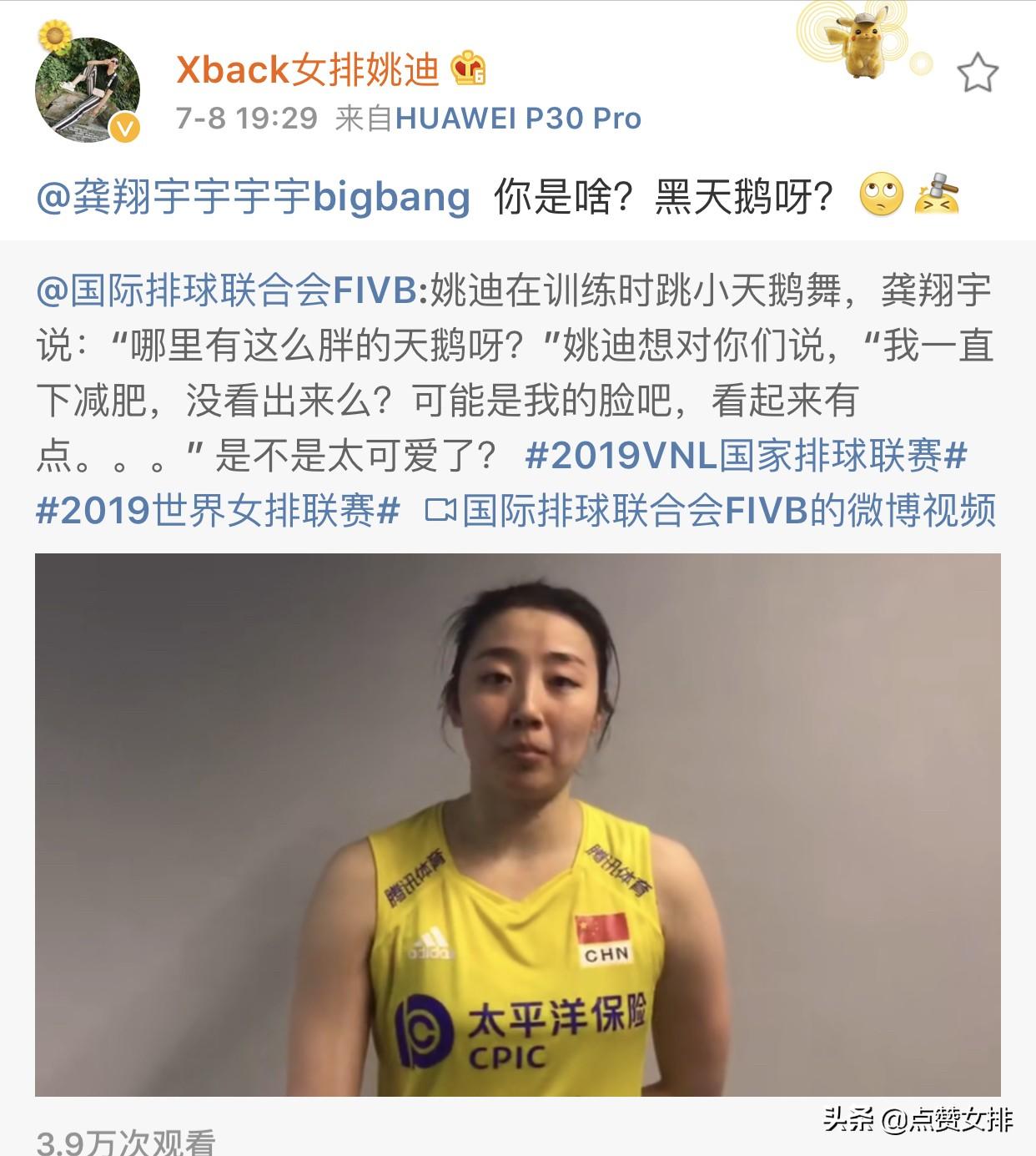当时,中国女排拿下了铜牌,国际排联女记者釆访姚迪,她一边曝料一边问:“我看见之前你在训练时跳小天鹅,龚翔宇说没见过这么胖的天鹅,你是胖了吗?小天鹅,姚天鹅?哈哈哈......”姚迪仰头大笑:“没有,我在减肥,我在减肥,我一直在很努力地减肥,大家没看到吗?可能是我的脸吧,看起来有点……哈哈”