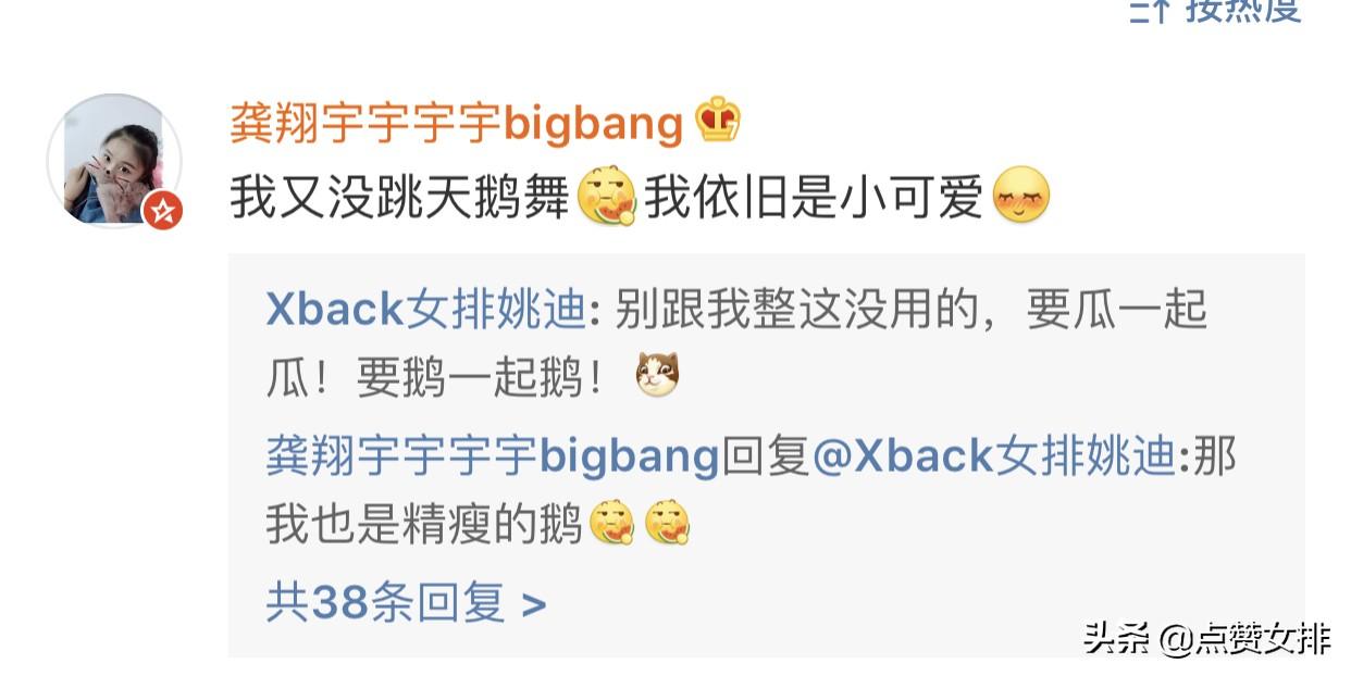 虽然面对记者的刁难巧妙地应对过去了,但姚迪却对龚翔宇“怀恨在心”,直接转发了这个采访视频并艾特龚翔宇:“你是啥,黑天鹅呀!”龚翔宇毫不示弱:“我又没跳小天鹅,我还是小可爱。”姚迪不依不饶:“别跟我整这没用的,要瓜一起瓜!要鹅一起鹅!”就这样,两人唇枪舌箭,评论区一片哗然。
