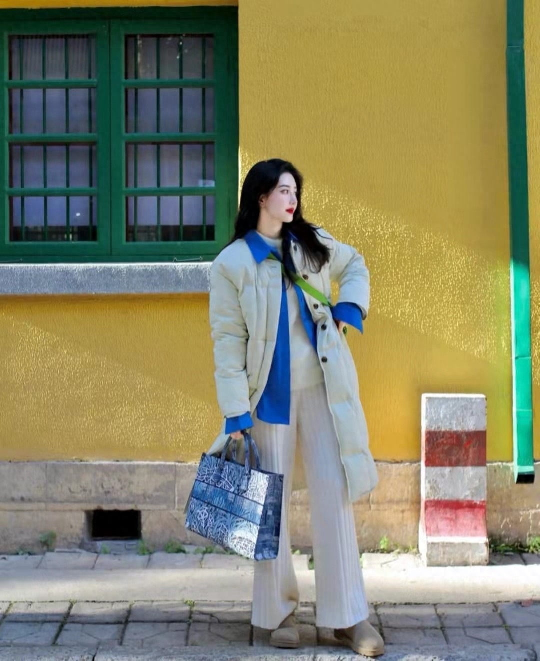 然后穿上一件翻领衬衫,明亮的蓝色色调,减龄大方,非常具有时尚气息。外面是一件带着无性别风气息的羽绒服,轻薄但保暖,也不缺潮流味道。